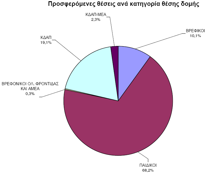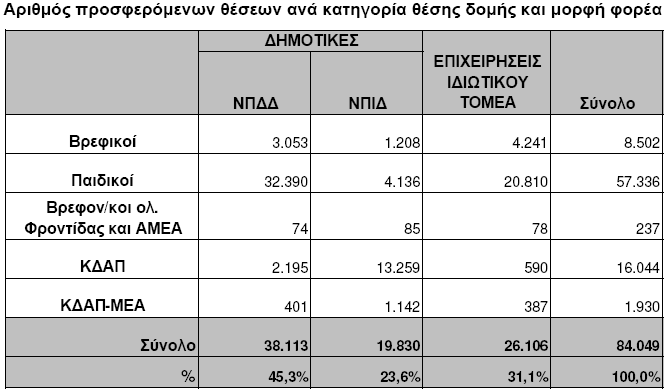 Σύμφωνα με τα στατιστικά στοιχεία που αφορούν τις επιλέξιμες δομές ανά είδος και φορέα προκύπτει ότι το 30 % είναι επιχειρήσεις ιδιωτικού τομέα, και το υπόλοιπο 70%, δημοτικές δομές κυρίως Βρεφικοί και Βρεφονηπιακοί σταθμοί. Οι διαθέσιμες 84.049 επιδοτούμενες θέσεις κατανέμονται στις δομές ως εξής: