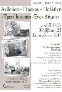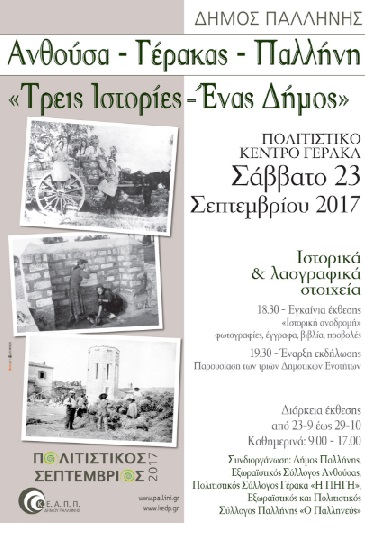 Εκδήλωση-έκθεση ιστορικών και λαογραφικών στοιχείων, αφιερωμένη στην ιστορία των τριών δημοτικών ενοτήτων που αποτελούν τον ενιαίο Δήμο Παλλήνης, και που από το 2010 πορεύονται σε κοινό δρόμο, θα πραγματοποιηθεί στο Πολιτιστικό Κέντρο Γέρακα, στο πλαίσιο των εκδηλώσεων του Πολιτιστικού Σεπτέμβρη 2017 . Η έκθεση θα διαρκέσει από τις 23 έως τις 29 Σεπτέμβρη.