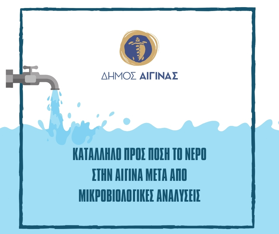 Σύμφωνα με ανακοίνωση του Δήμου Αίγινας, κατάλληλο προς πόση είναι πλέον το νερό στην Αίγινα, μετά την ολοκλήρωση των απαραίτητων ελέγχων και ενεργειών για την αποκατάσταση της ποιότητας του δικτύου ύδρευσης.