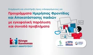 Το Κέντρο Κοινότητας του Δήμου Αμαρουσίου ενημερώνει δημότες και τους κατοίκους της περιοχής που ενδιαφέρονται, να δηλώσουν συμμετοχή στο Πρόγραμμα Ημερήσιας Φροντίδας και Αποκατάστασης παιδιών με εγκεφαλική παράλυση και συνοδά προβλήματα, ηλικίας έως 12 ετών.