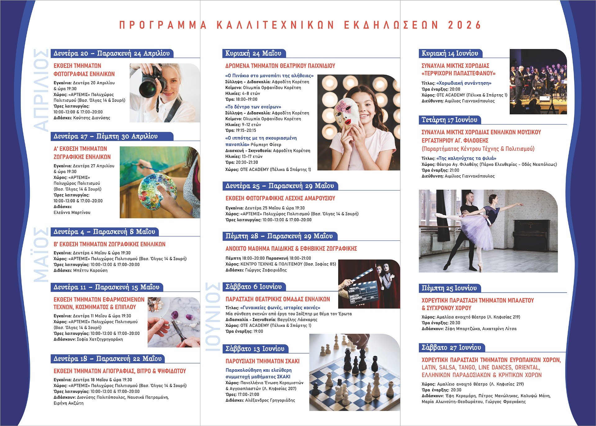 Οι εκδηλώσεις θα πραγματοποιηθούν από τις 20 Απριλίου έως και τις 27 Ιουνίου 2026 και περιλαμβάνουν εκθέσεις, παραστάσεις και ποικίλες καλλιτεχνικές δράσεις, αναδεικνύοντας τη δημιουργική δουλειά των συμμετεχόντων στα τμήματα του Δήμου.