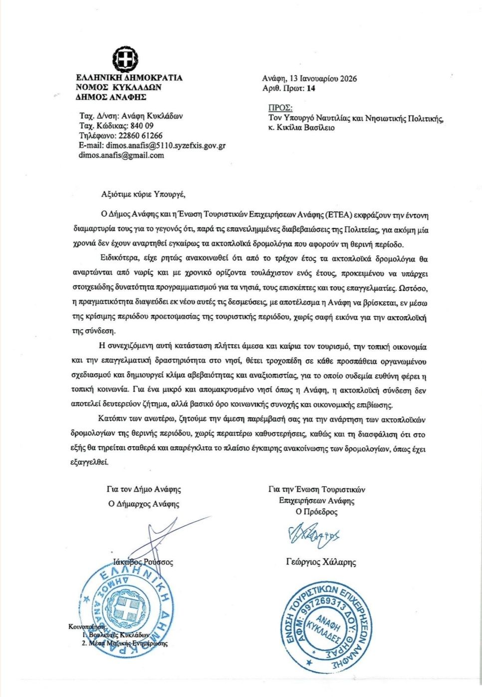 «Για ένα μικρό και απομακρυσμένο νησί όπως η Ανάφη, η ακτοπλοϊκή σύνδεση δεν αποτελεί απλώς ζήτημα μετακίνησης, αλλά βασικό όρο κοινωνικής συνοχής, οικονομικής επιβίωσης», αναφέρεται χαρακτηριστικά.