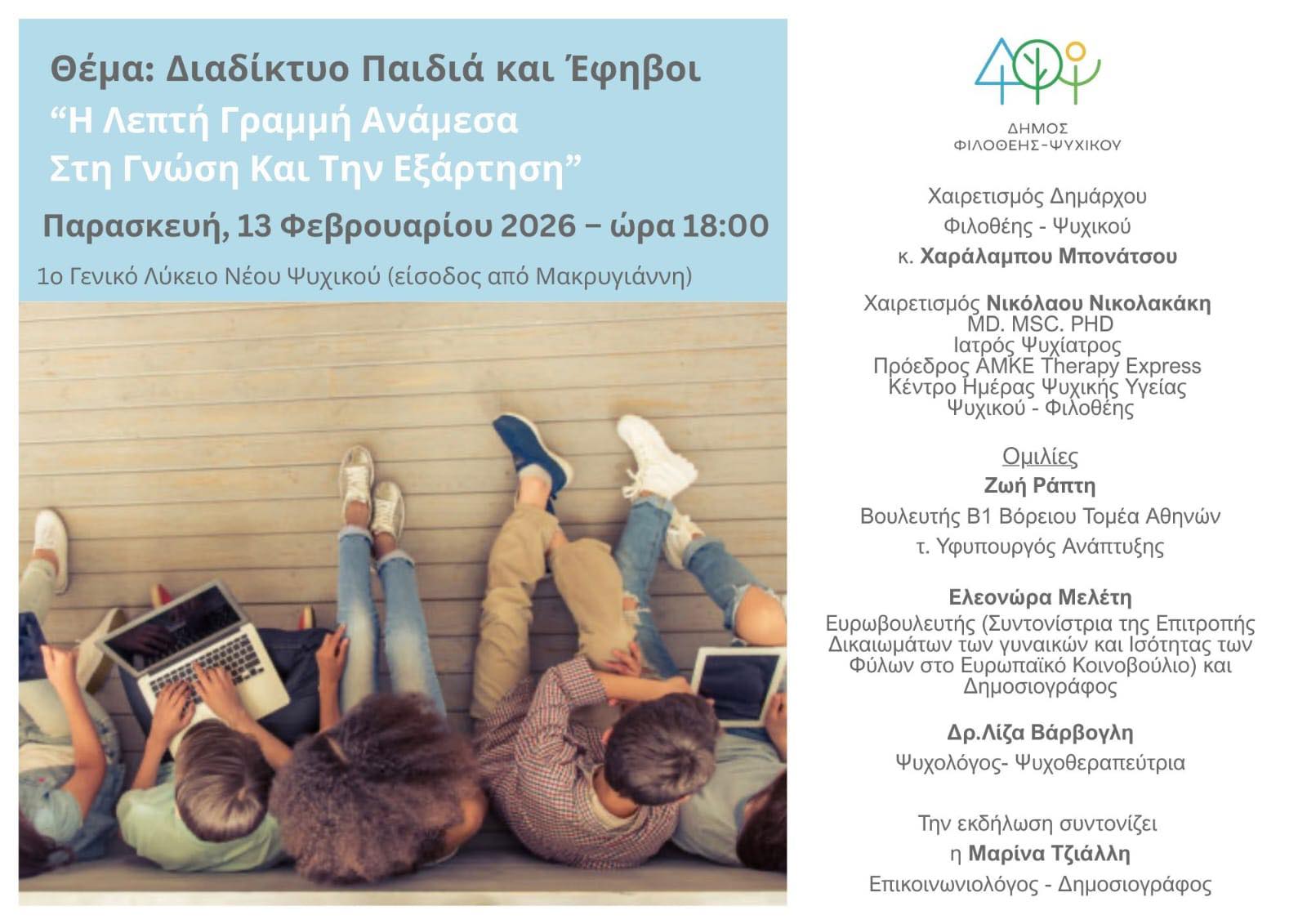 Ο Δήμος Φιλοθέης-Ψυχικού διοργανώνει εκδήλωση με θέμα «Διαδίκτυο, Παιδιά και Έφηβοι: Η λεπτή γραμμή ανάμεσα στη γνώση και την εξάρτηση», την Παρασκευή 13 Φεβρουαρίου 2026, στις 18:00, στο 1ο Γενικό Λύκειο Ν.Ψυχικού (Είσοδος από Μακρυγιάννη). Ειδικότερα, στο επίκεντρο της εκδήλωσης θα βρεθεί η ασφαλής και ισορροπημένη χρήση του διαδικτύου από παιδιά αλλά και εφήβους.