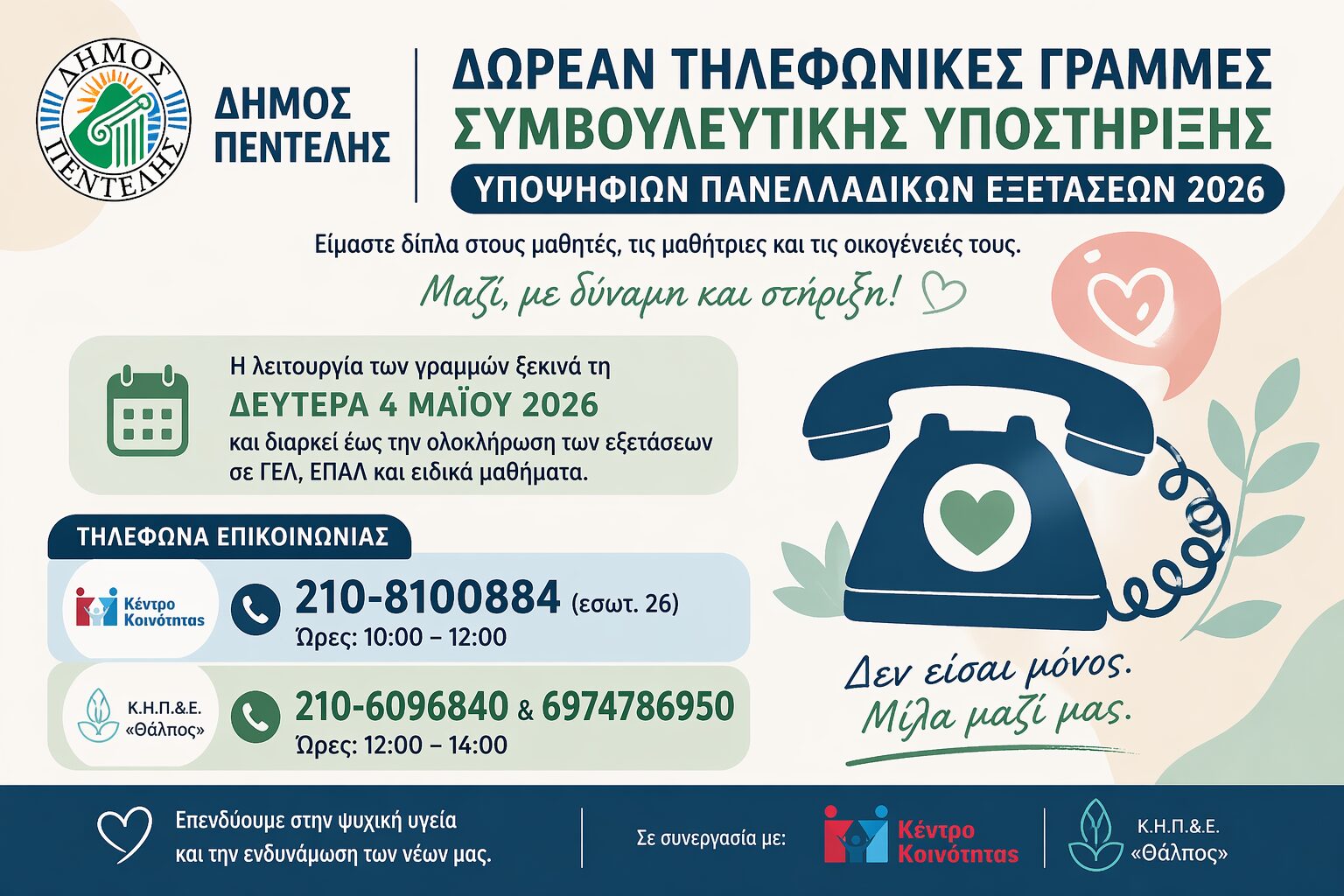 Ο Δήμος Πεντέλης θέτει σε λειτουργία δωρεάν τηλεφωνικές γραμμές συμβουλευτικής και ψυχολογικής υποστήριξης για υποψηφίους των Πανελλαδικών Εξετάσεων, στο πλαίσιο των δράσεων στήριξης της μαθητικής κοινότητας και των οικογενειών της.