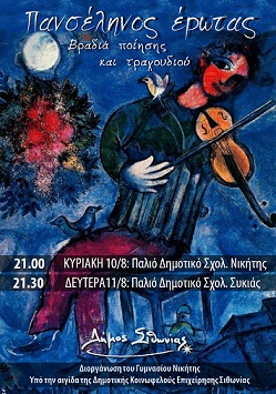 Βραδιά ποίησης και τραγουδιού με τίτλο «Πανσέληνος Έρωτας» διοργανώνει για δεύτερη χρονιά το Γυμνάσιο Νικήτης, υπό την αιγίδα της Δημοτικής Επιχείρησης του Δήμου Σιθωνίας, με αφορμή την Αυγουστιάκη Πανσέληνο.