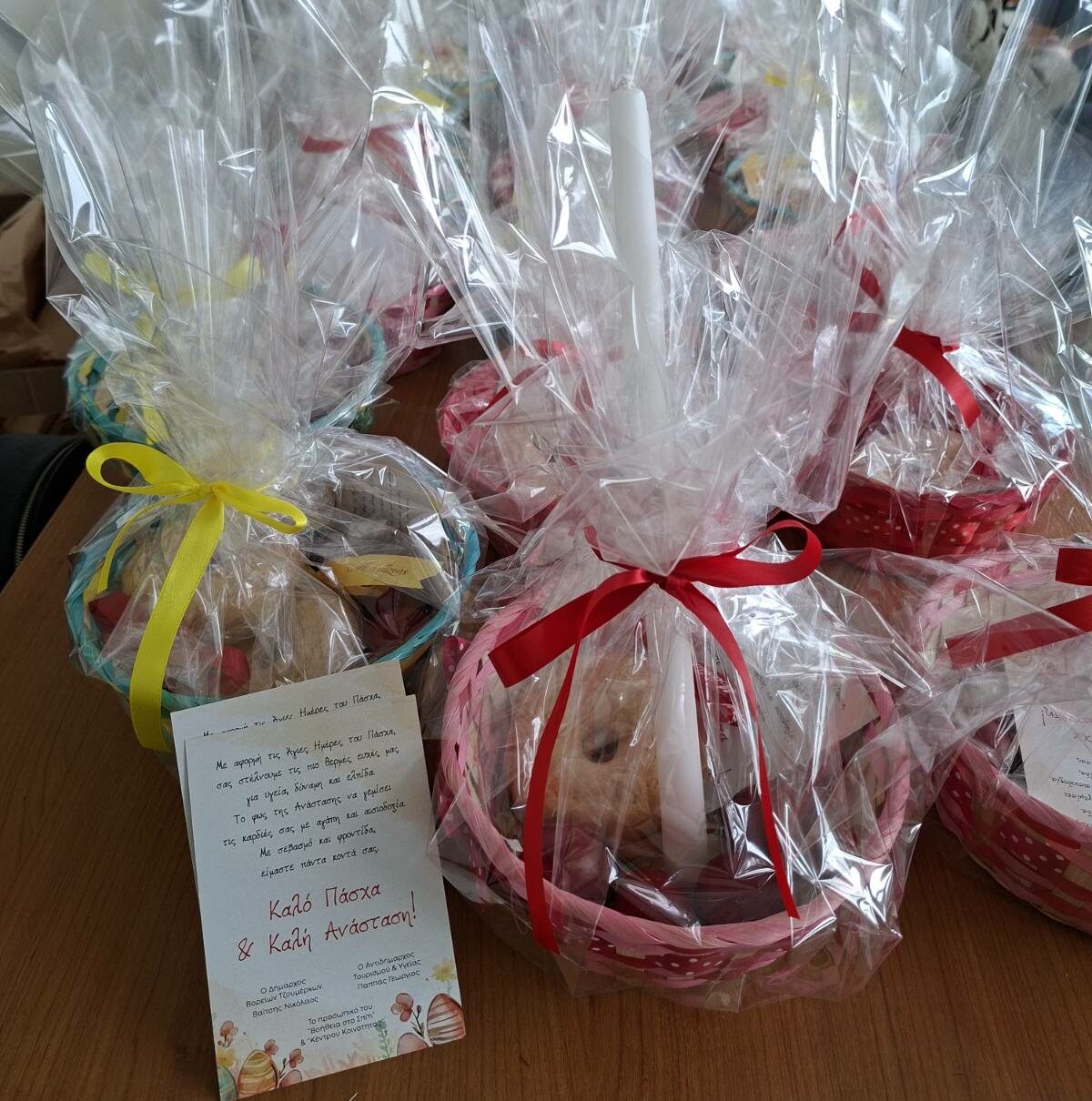Τα πασχαλινά καλάθια περιλάμβαναν βασικά είδη διατροφής, αλλά και παραδοσιακά πασχαλινά προϊόντα, όπως αυγά, κουλούρια και λαμπάδες. Κατ’ αυτόν τον τρόπο, πέρα από το μήνυμα ζεστασιάς και ελπίδας, η διανομή αυτή συνέβαλε ουσιαστικά στην κάλυψη αναγκών των ωφελούμενων, αλλά και στη δημιουργία ενός πιο ζεστού εορταστικού κλίματος για το Πάσχα.