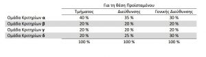 Για την τελική μοριοδότηση, ο συνολικός αριθμός των μορίων κάθε ομάδας κριτηρίων πολλαπλασιάζεται με τους συντελεστές που αναγράφονται στον πίνακα που ακολουθεί: