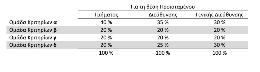 Ανάλογα με το επίπεδο της προκηρυσσόμενης θέσης ευθύνης, οι ομάδες κριτηρίων α και δ έχουν διαφορετικό συντελεστή βαρύτητας στη συνολική βαθμολογία του υποψηφίου.