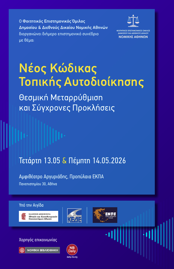 Υπό την αιγίδα της Κεντρικής Ένωσης Δήμων Ελλάδας (ΚΕΔΕ) και της Ένωσης Περιφερειών Ελλάδας (ΕΝΠΕ), ο Φοιτητικός Επιστημονικός Όμιλος Δημόσιου και Διεθνούς Δικαίου Νομικής Αθηνών διοργανώνει διήμερο Επιστημονικό Συνέδριο με τίτλο: «Νέος Κώδικας Τοπικής Αυτοδιοίκησης: Θεσμική Μεταρρύθμιση και Σύγχρονες Προκλήσεις».