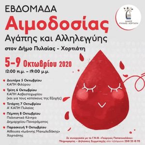 Πρωτοβουλία Αγάπης και Αλληλεγγύης προς τους πάσχοντες συνανθρώπους μας με τη διοργάνωση νέας Εβδομάδας Αιμοδοσίας από τις 5 έως τις 9 Οκτωβρίου σε όλες τις Δημοτικές του Ενότητες παίρνει ο δήμος Πυλαίας – Χορτιάτη σε αυτές τις δύσκολες ώρες που η χώρα μας καλείται να δώσει την κρίσιμη μάχη της για να αντιμετωπίσει το δεύτερο κύμα της πανδημίας.