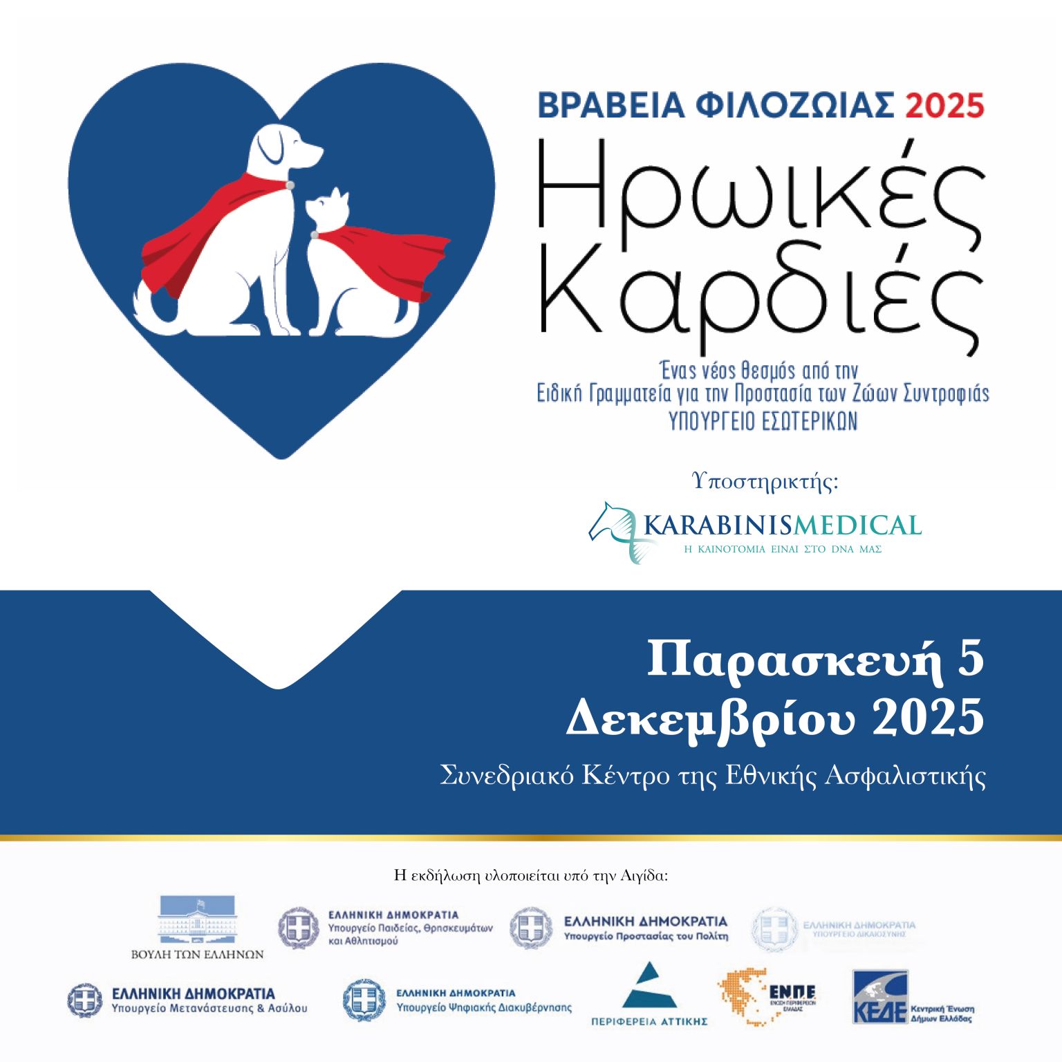 Η πρώτη μεγάλη τελετή απονομής των «Βραβείων Φιλοζωίας 2025 – Ηρωικές Καρδιές», μια πρωτοβουλία της Ειδική Γραμματεία Προστασίας των Ζώων Συντροφιάς του Υπουργείο Εσωτερικών, που βρήκε θερμή υποστήριξη και συγκινητική ανταπόκριση από εθελοντές, φορείς, δήμους και πολίτες από όλη την Ελλάδα πραγματοποιήθηκε την Παρασκευή 5 Δεκεμβρίου 2025, στο Συνεδριακό Κέντρο της Εθνικής Ασφαλιστικής.