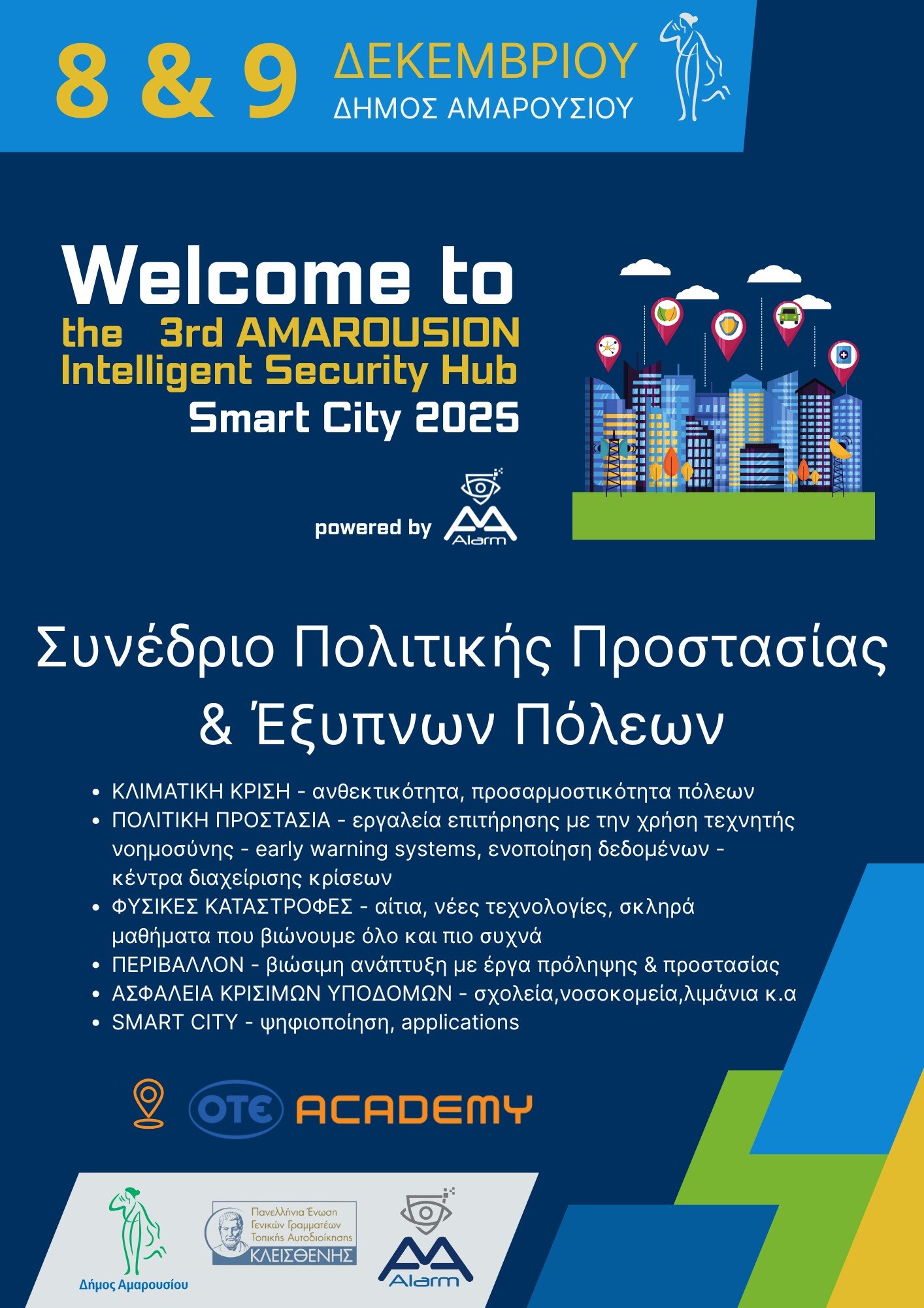 Με μεγάλη επιτυχία ολοκληρώθηκε στο Μαρούσι το διήμερο Συνέδριο Πολιτικής Προστασίας & Έξυπνων Πόλεων, που διοργάνωσε ο Δήμος Αμαρουσίου σε συνεργασία με την Πανελλήνια Ένωση Γενικών Γραμματέων Τοπικής Αυτοδιοίκησης “Κλεισθένης” και την εταιρεία AA-ALARM smart security solutions, κατά το διήμερο 8 και 9 Δεκεμβρίου 2025.