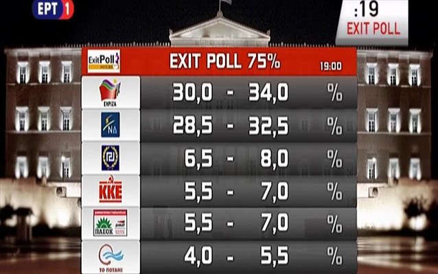 Με τον ΣΥΡΙΖΑ να προηγείται στα exit poll ,τη ΝΔ στη δεύτερη θέση, τη Λαϊκή Ενότητα να είναι οριακά και τη Χρυσή Αυγή τρίτο κόμμα ολοκληρώθηκε η πρώτη εκτίμηση του εκλογικού αποτελέσματος.