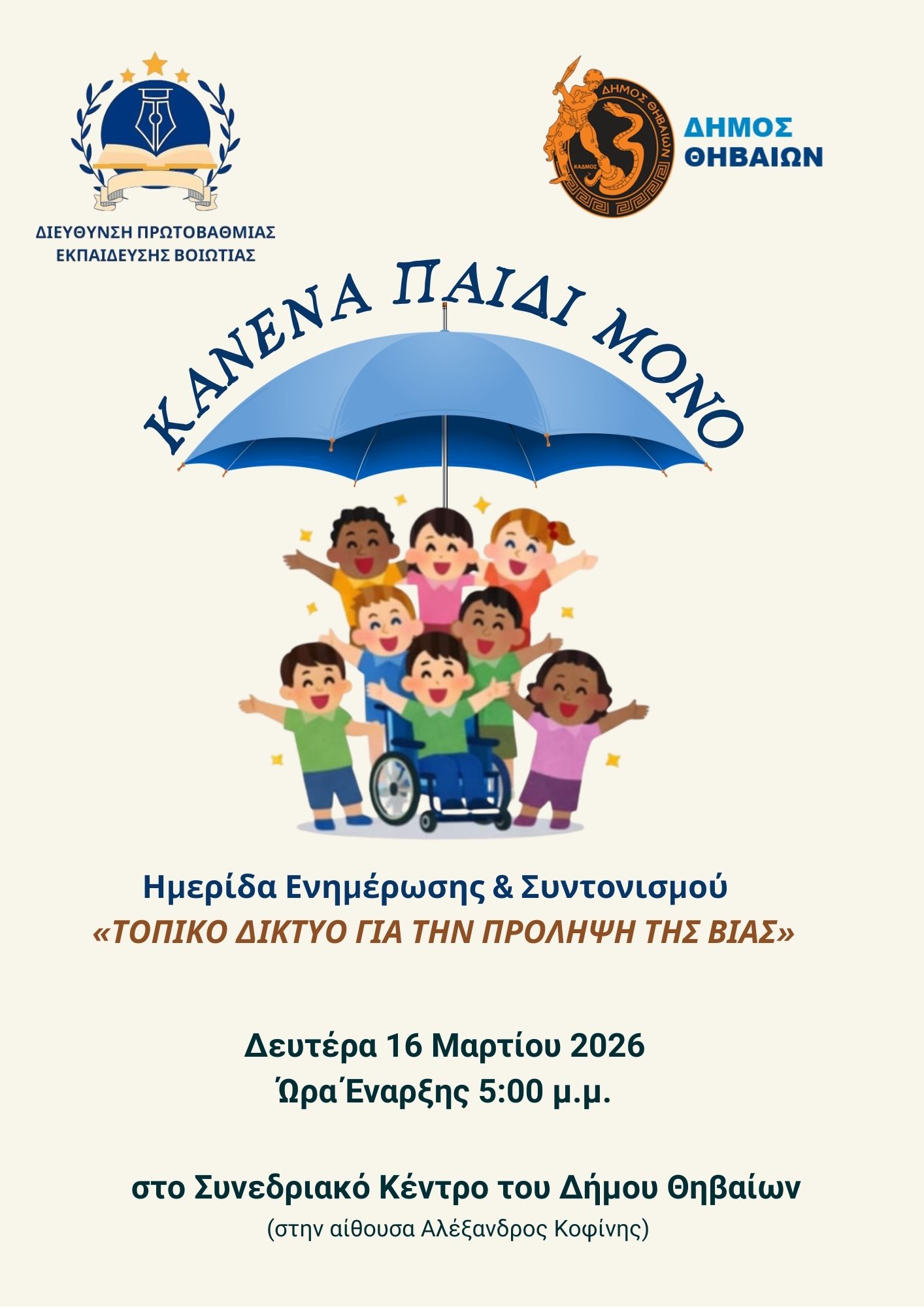 «Κανένα παιδί μόνο. Μια ομπρέλα προστασίας σε κάθε γειτονιά», είναι το σύνθημα της πρωτοβουλίας για τη δημιουργία ενός πλαισίου ασφαλείας και υποστήριξης για τα παιδιά, στο πλαίσιο συνεργασίας της Πρωτοβάθμιας Εκπαίδευσης Βοιωτίας και των Δήμων του Νομού.