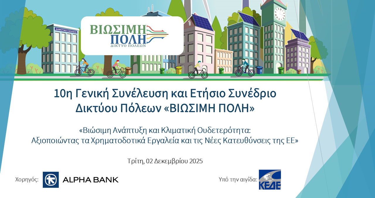Το Δίκτυο Πόλεων «ΒΙΩΣΙΜΗ ΠΟΛΗ» διοργανώνει την Τρίτη 2 Δεκεμβρίου 2025, στις 16:30, το Ετήσιο Συνέδριο και τη Γενική του Συνέλευση στο ξενοδοχείο Wyndham Grand Athens, με τίτλο: