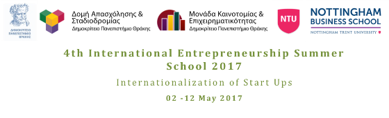 Η Μονάδα Καινοτομίας και Επιχειρηματικότητας της Δομής Απασχόλησης και Σταδιοδρομίας (ΔΑΣΤΑ) του Δημοκρίτειου Πανεπιστημίου Θράκης, σε συνεργασία με το Business School του Πανεπιστημίου Nottingham Trent, UK, διοργανώνουν το 4ο Διεθνές Θερινό Σχολείο Επιχειρηματικότητας 2017, από τις 02 έως και τις 12 Μαΐου στην Πολυτεχνειούπολη Κιμμερίων στην Ξάνθη.